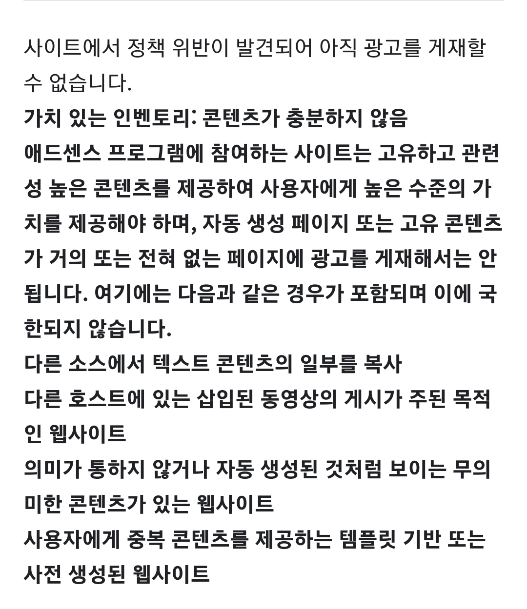 5. 템플릿 기반 또는 사전 생성된 사이트: 제목이 중복되거나 겹치면 문제가 되기도 하고 너무 같은 형식으로 포스팅해도 그렇다는 말이 있다고 하니 가끔 포스팅 형식에 변화를 주세요.저는 2번의 동일 사유로 승인 거절을 받았고 마지막 검토요청까지 심기일전하여 1일 1 포스팅을 실천했습니다.