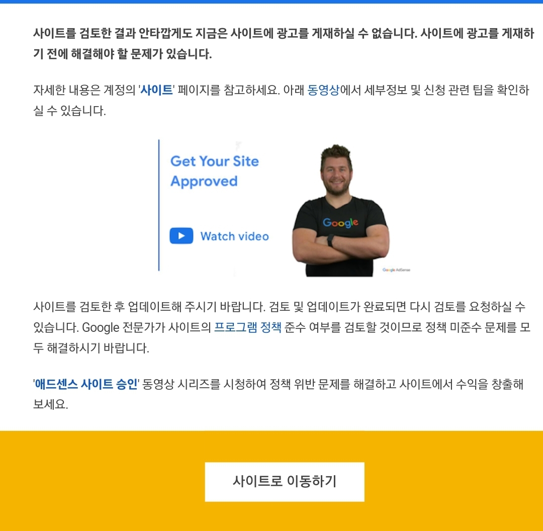 승인 거절 메일 위의 사진은 2주 정도 지난 후에 구글 로봇의 심사기준을 통과하지 못했을 때 받는 메일입니다.