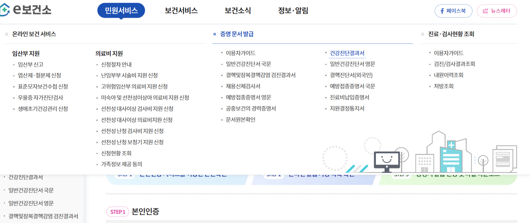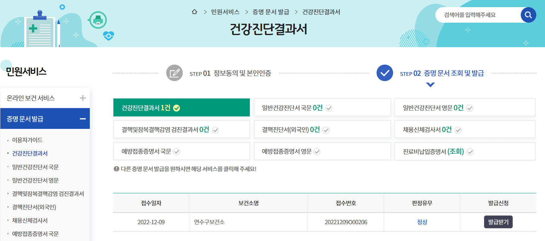 2. 민원 서비스 -증명 문서 발급-건강진단결과서 선택합니다.
