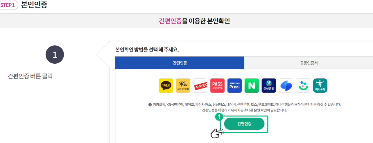 민원 서비스에서 발급 3. 약관 동의 확인- 개인정보 확인(간편 인증이나 공인인증 선택)