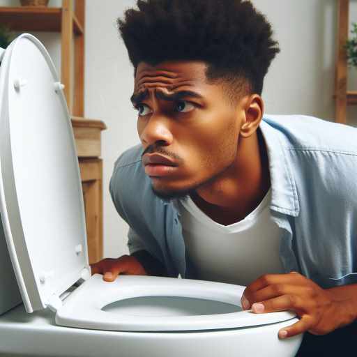 변기를 보며 걱정스러워하는 남자 소변의 색이 탁해요