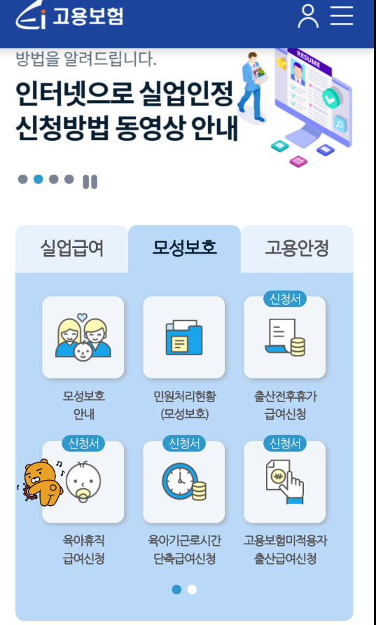 고용보험 앱을 다운로드하여 모성보호 탭에서 육아휴직 급여 신청 가능합니다.