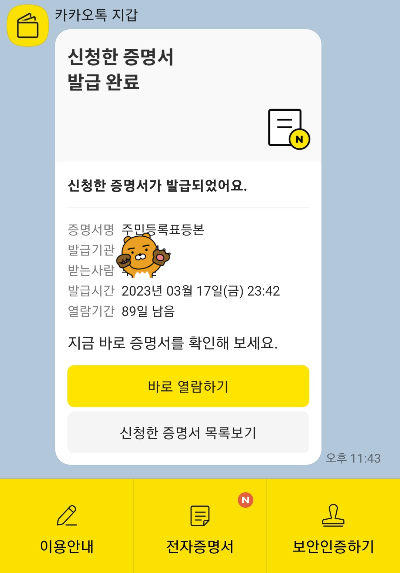 카카오톡 지갑에서 바로확인이 가능하니 급할 때 주민센터에 직접 가지 않고