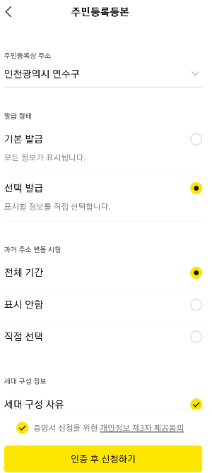 제3자 동의 후 신청해주세요 6. 모든 정보가 표시되는 기본발급인지 필요정보만 표시되는 선택발급인지 고르시고