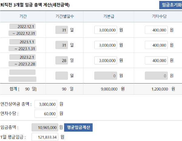 퇴직 전 3개월 평균임금: 세전 금액 기준입니다.