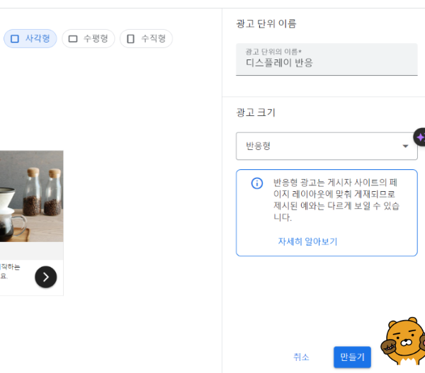 사각형 선택하고 광고이름 편하게 정하세요 광고이름을 편하게 아무거나 적어주시고 반응형-사각형 선택해 주시고 만들기를 누릅니다.
