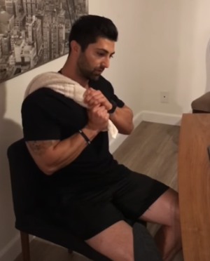 ● 엉덩이로 수건을 깔고 앉아 어깨 위로 수건을 넘기고 앞으로 잡아당겨 줍니다. (두 번째 사진)