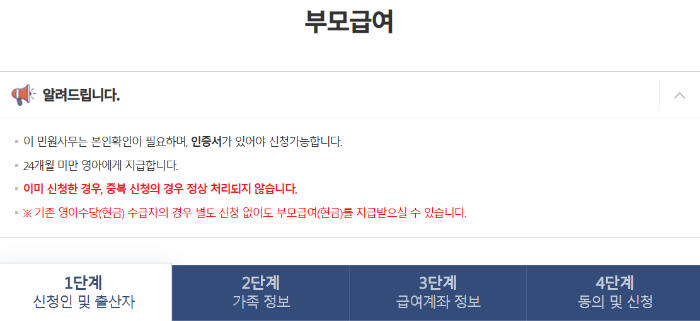 부모급여 신청 선택 3. 신청인 및 출산자 정보 입력-가족 정보 입력- 계좌정보 입력- 동의 및 신청완료